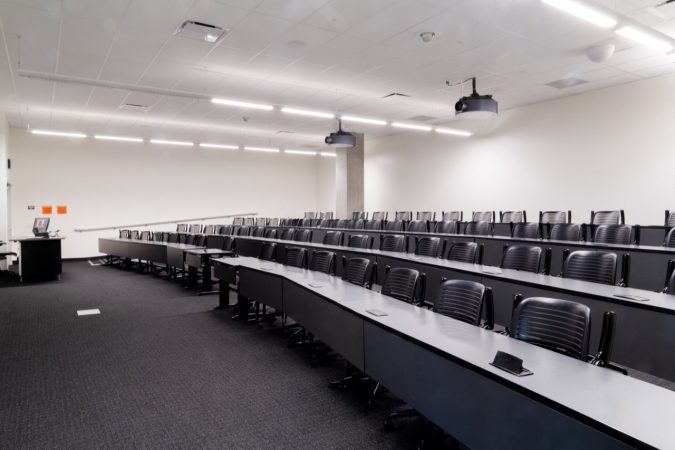 Description: Tiered Theater-style classroom. Equipped with two screens and projectors.